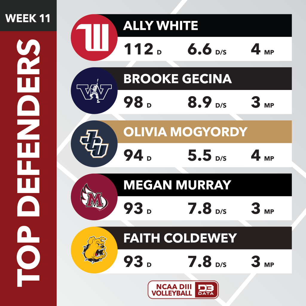 The top defenders across all of DIII Volleyball in week 11 of the 2024 season.