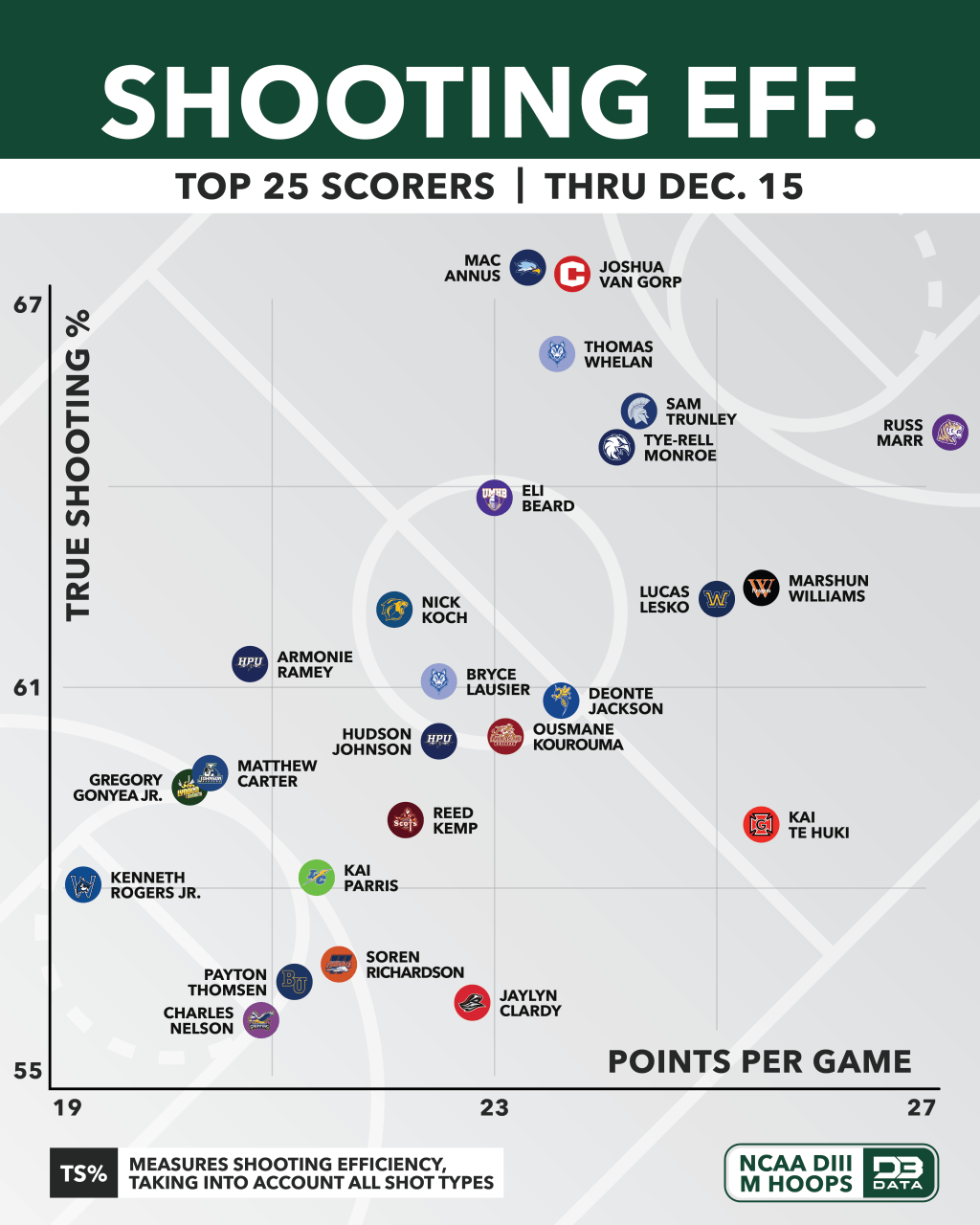 Points per game versus True Shooting % for the top 50 scorers in DIII Men’s Hoops through Dec. 15.