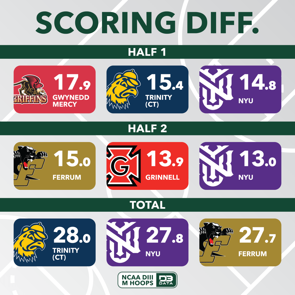 The top second half team is Ferrum (9-1) who tops their opponents by 15.0 points per game.
