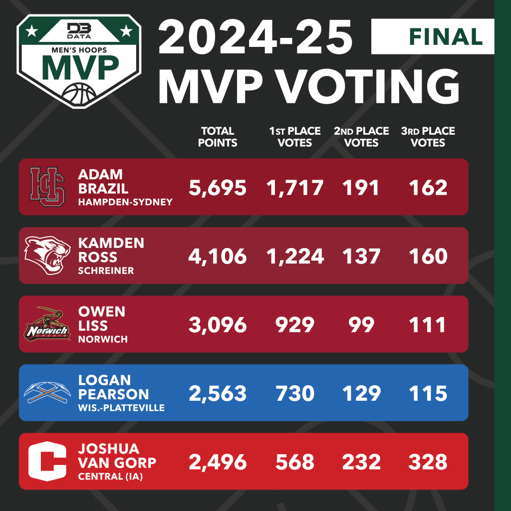 After nearly a month and over 9,000 ballots cast, Adam Brazil of Hampden-Sydney has been voted the 2024-25 D3 Data Men’s Hoops MVP.