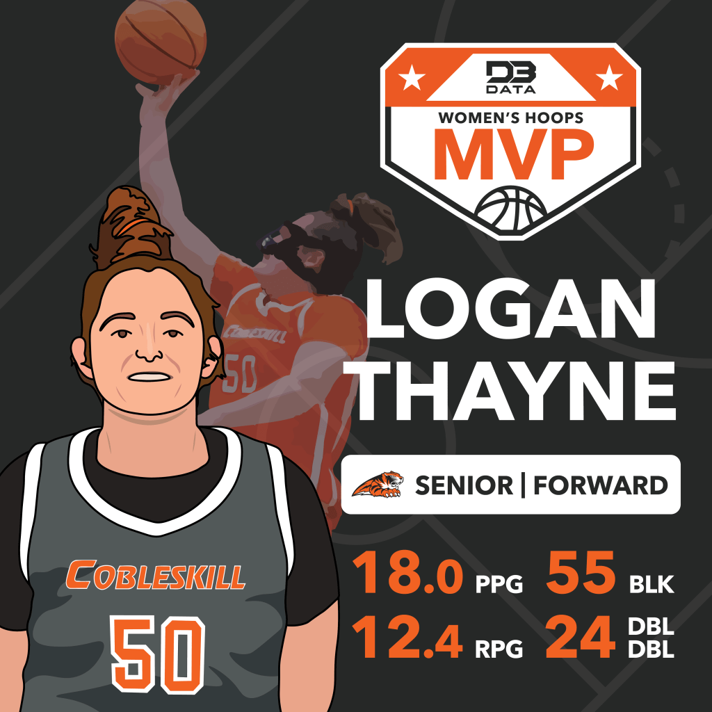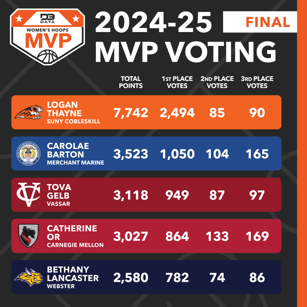 A month of voting and nearly 10,000 ballots cast, Logan Thayne of SUNY Cobleskill has been voted the 2024-25 D3 Data Women’s Hoops MVP.